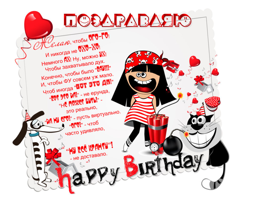 С днем рожденья поздравляю. Весело тебе желаю, Чтоб мечты были смелее, Стан и бедра — лишь стройнее. Шубу новую, машину И роскошного мужчину, Миллионы алых роз, Украшений паровоз, Сбывшихся надежд вагон… Ну а взяв серьезный тон: Пусть несет тебе судьба То, что хочешь ты сама!
