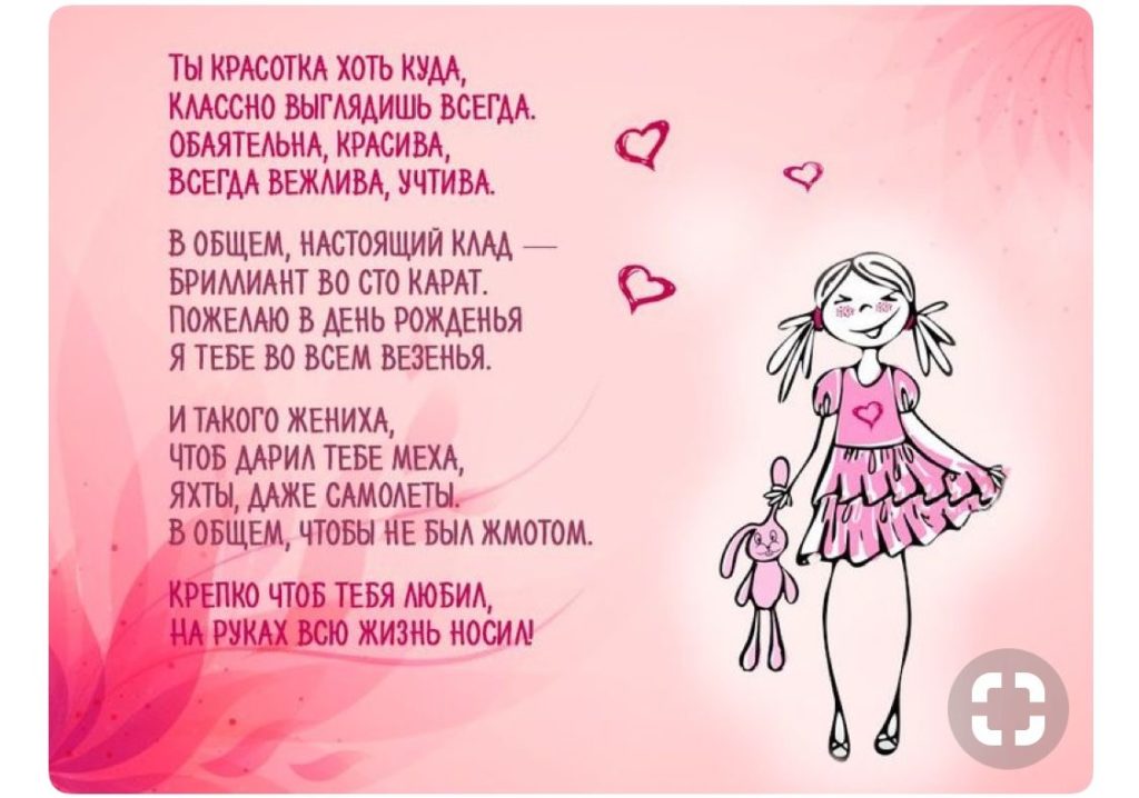 Пусть красота с тобою будет,Еще достаток и любовь.Тебе ведь снова 18,Сегодня их отметим вновь!