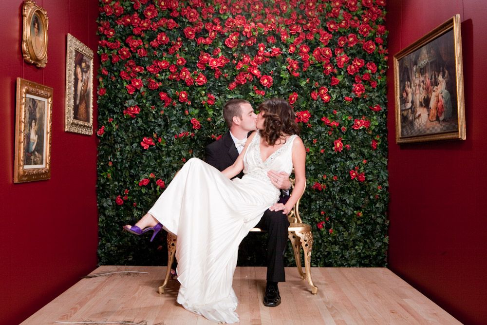 Можно сделать мини-комнату, 2 стены в которой заклеить классическими обоями с картинами, а одну главную стену задекорировать цветами и искусственной зеленью. Отметим, что это достаточно необычный способ сделать фотозону, который летом встретишь нечасто, но, если ваша свадьба проходит в дождь или в снег — то это отличный вариант.