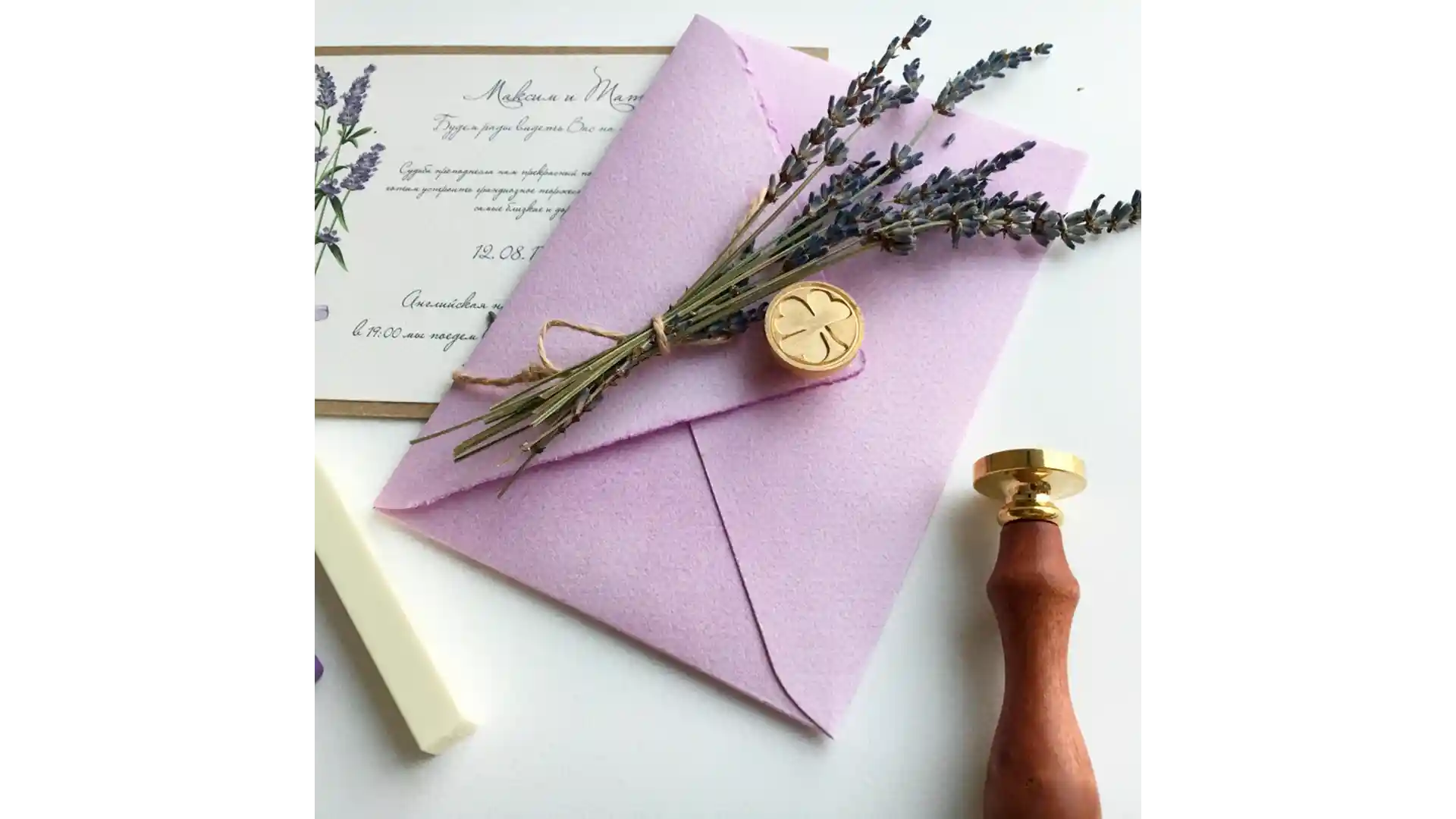 При оформлении пригласительных идеальным решением будет использовать кружево, веточки лаванды. Приветствуется ручная работа, а не применение стандартных открыток. Используются оттенки фиолетового, за основу лучше взять пастельные тона. Общий фон создается при помощи молочного и светло-серого, яркие детали добавит оливковый, сиреневый или терракот.