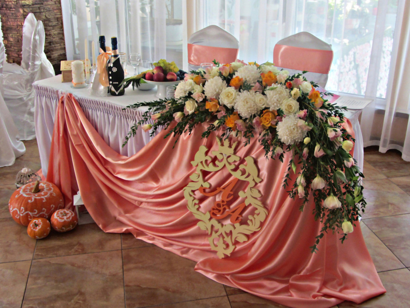 Стол молодоженов устанавливают и оформляют отдельно. Декорируют легкими воздушными скатертями, лентами, цветами, подобранными в тон основного цвета свадебной церемонии.