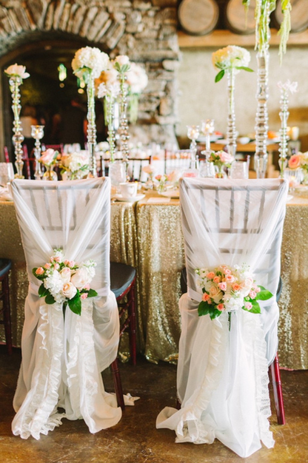 Не менее популярным оказалось украшение цветами стульев. Несмотря на то, что традиционно ткань скрепляют объемным бантом, красивыми лентами, сегодня довольно часто можно встретить в качестве скрепляющего элемента цветочные композиции: