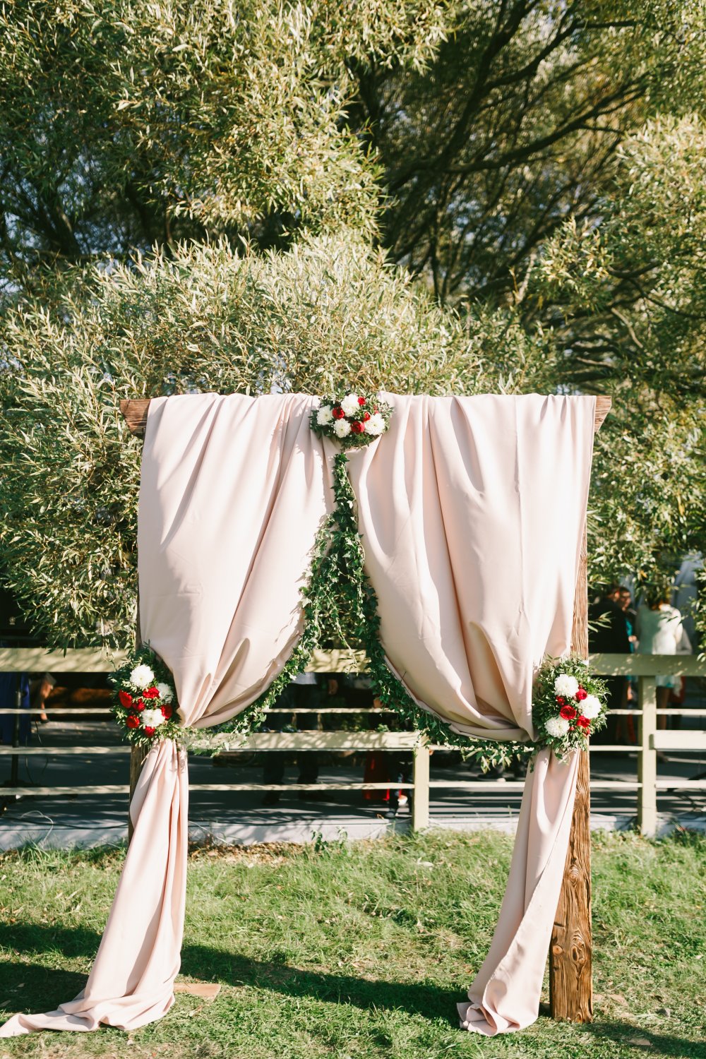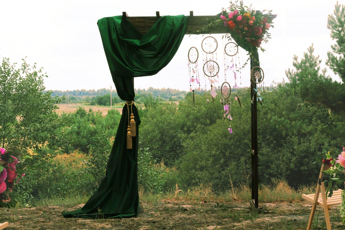 Удивительная арка украшенная тканью богатого изумрудного оттенка и гирляндой состоящей из ловцов снов. К слову, такая композиция может дополнить свадьбу в стиле кинофильма «Унесенные ветром». Помните штору из которой главная героиня сшила себе платье?