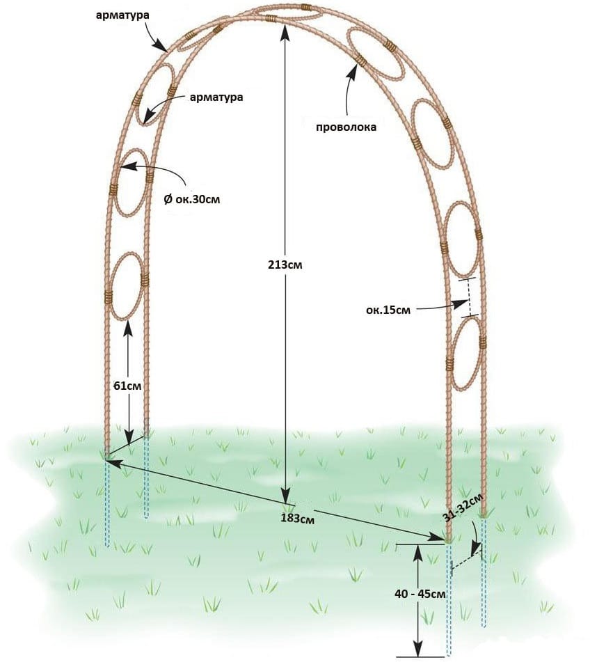 Чтобы укрепить арку можно использовать раствор из цемента, либо вкопать арку в землю.