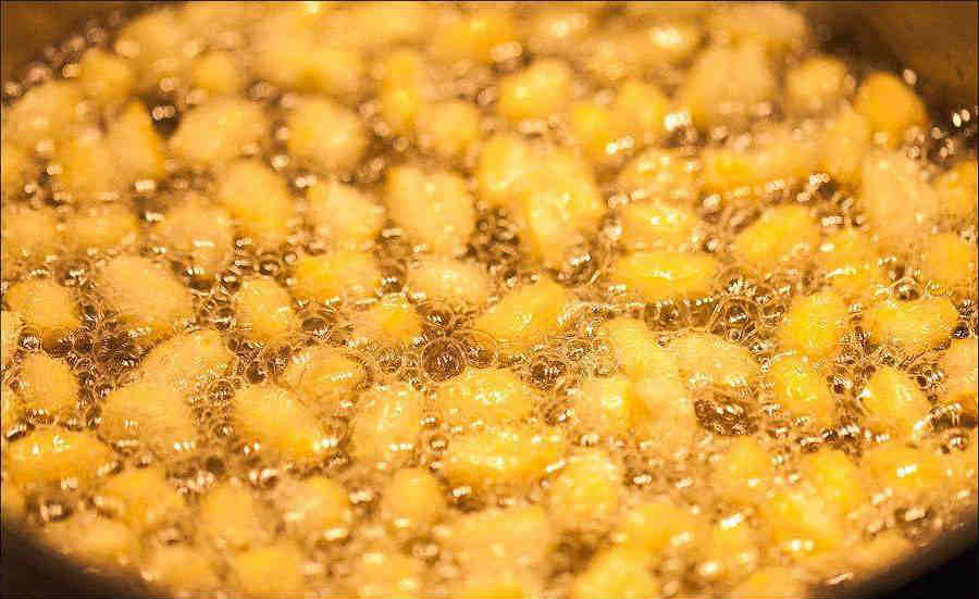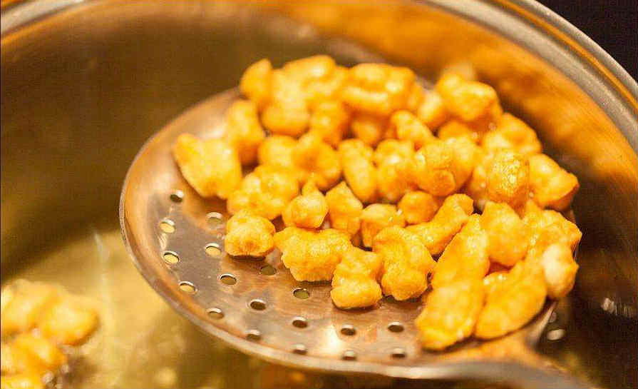 7. Как только вы увидите, что комки стали желтеть сразу же их вынимайте при помощи шумовки. После закиньте следующую порцию, итак до тех пор, пока все не пережарите.