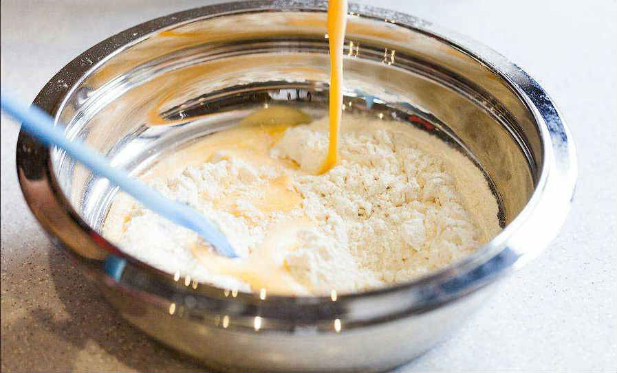 - Муку постарайтесь добавлять постепенно маленькими порциями, чтобы в массе не было комочков. Смешивайте тесто вручную до того момента, пока оно полностью не станет эластичным.