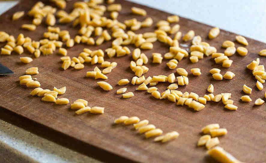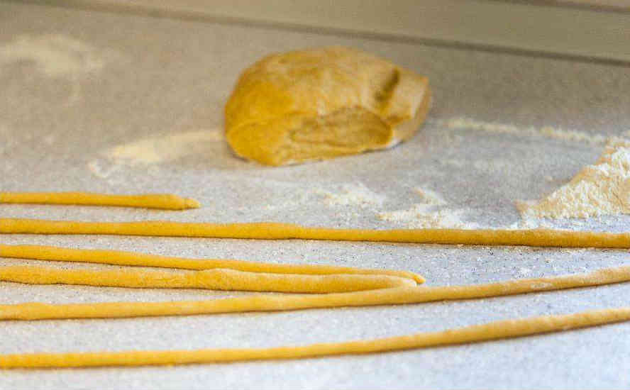 - При помощи ножа порежьте тесто на тонкие валики, после чего порежьте его на кусочки размером не больше шести миллиметров.