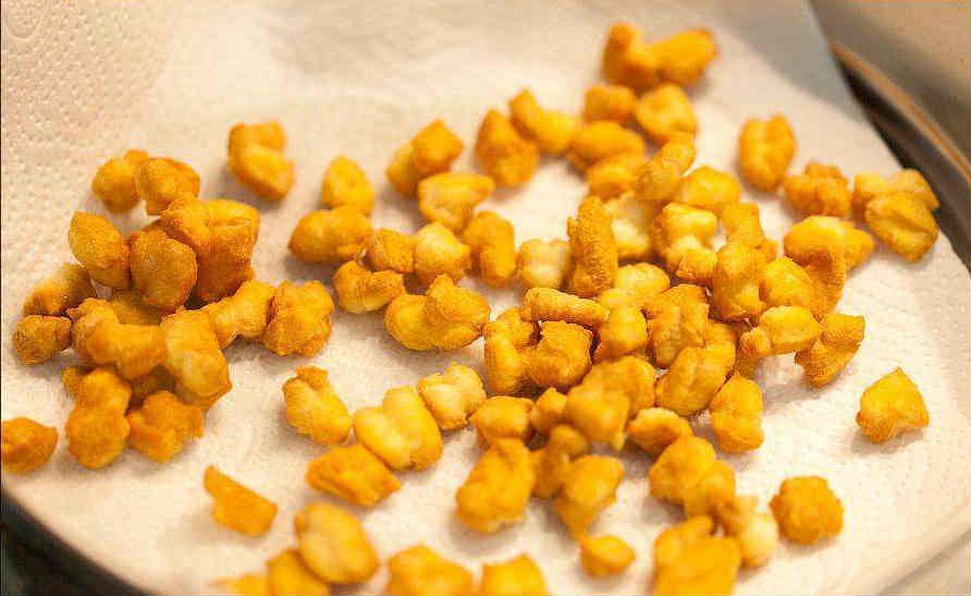 5. Теперь, когда убедились что масло достаточно разогрелось выкладывайте остальные кусочки и размешайте в масле. Жарьте до золотистого цвета, примерно 2-3 минуты. Готовые кусочки выложите на бумажное полотенце, что бы лишнее масло впиталось в него.