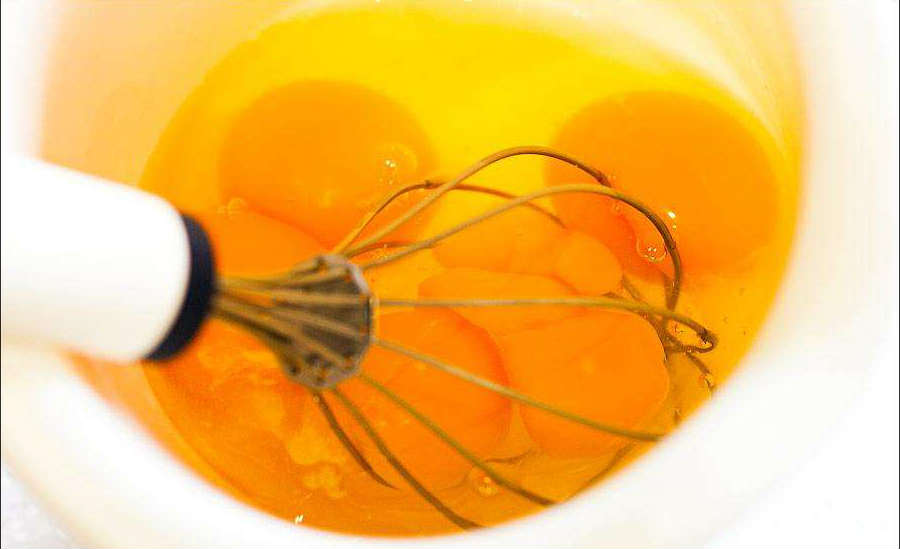 1. Сначала немного поколите, а затем взбейте яйца миксером до тех пор, пока не будут разбиты все крупные комочки желтка.