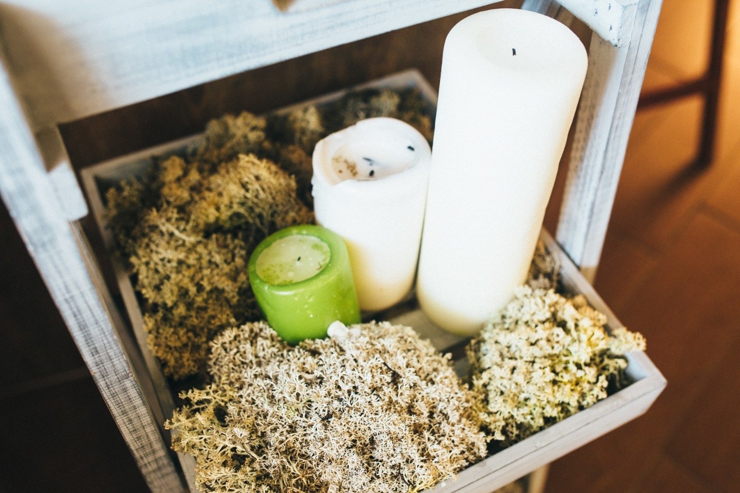 В качестве декора подойдут искусственные цветы. Во время декорирования используются льняные ткани, мешковина, кофейные зерна, еловые шишки, сушеные ягоды. Но не стоит забывать о правилах пожарной безопасности.