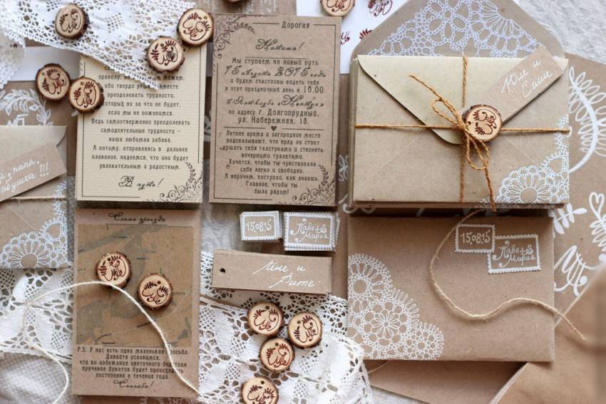 На карточках преобладает кружево, элементы декора. Сами пригласительные помещаются в конверт, иногда перевязываются лентой.