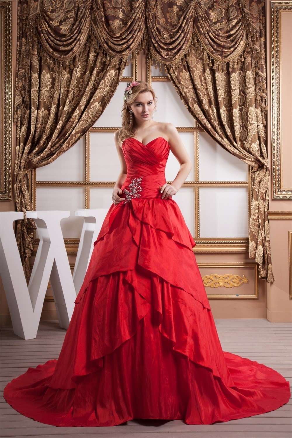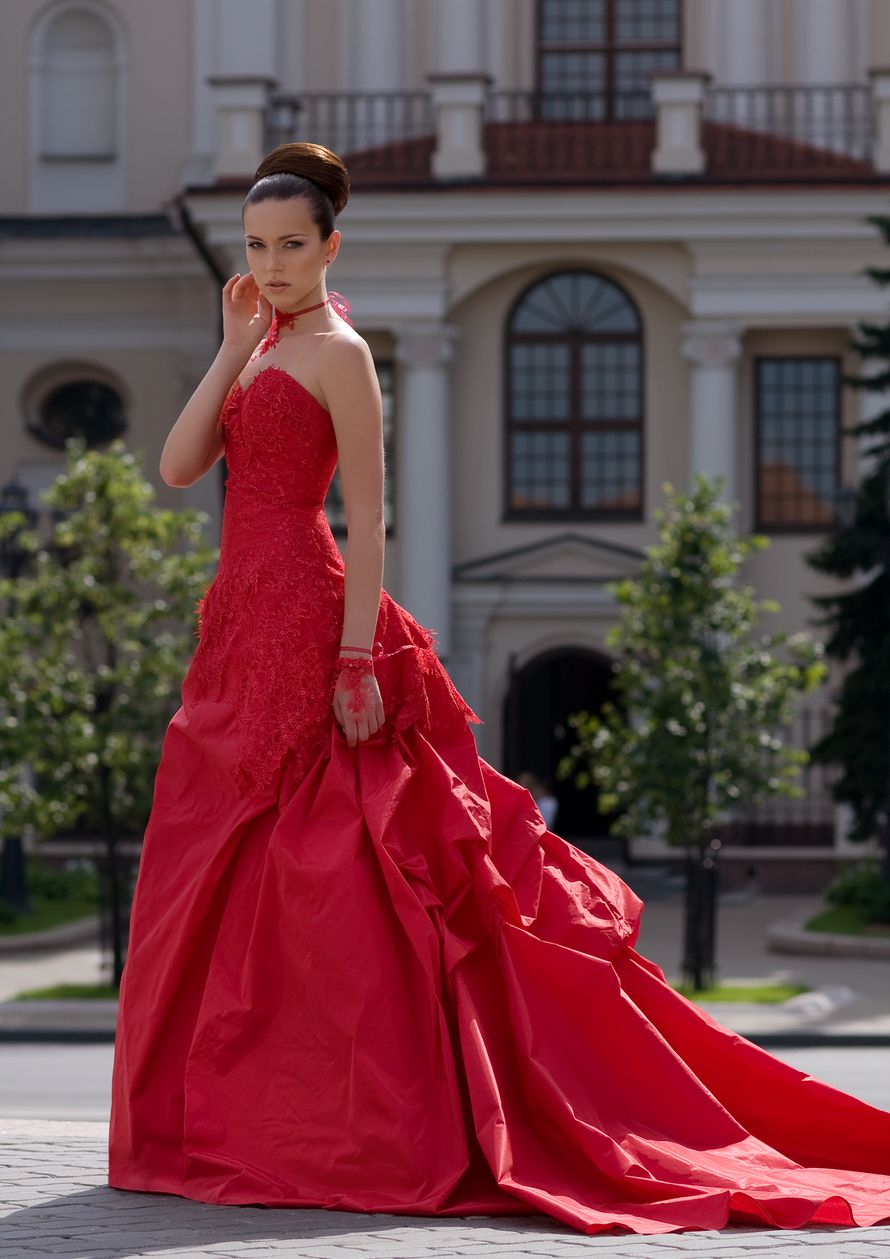 Красная лента, повязанная вокруг талии или бедер, и плавно переходящая в шлейф, подходит для свадебных платьев с корсетом и ниспадающей, длинной, тянущейся по полу юбкой. Такой фасон в королевском стиле делает невесту чрезвычайно элегантной, женственной, удлиняет ноги, увеличивает бюст, создает иллюзию абсолютно правильных пропорций. Очень красиво смотрится алый шлейф на платьях с пышными, многослойными юбками.
