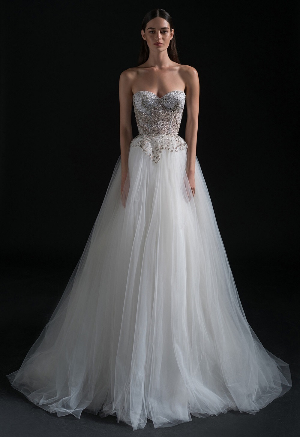 А вот полная противоположность – минималистичные платья, которые можно увидеть почти во всех коллекциях мировых модельеров. Кажется, что они неподвластны времени! Это идеальный вариант для тех невест, которые не любят цветочные аппликации или вышивку. А чтобы такая модель платья не казалась слишком скучной, ее изюминкой может стать необычный крой декольте или карманы.