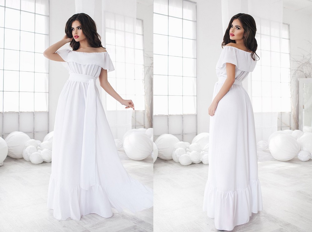 Для ценителей классики в летних коллекциях найдутся и длинные наряды. Это чаще всего платья из тонкой, летящей ткани, с открытым верхом и обилием складок. Также можно встретить варианты с короткой юбкой, но длинным шлейфом, визуально удлиняющим силуэт. Идеальное решение для невысоких, хрупких девушек.