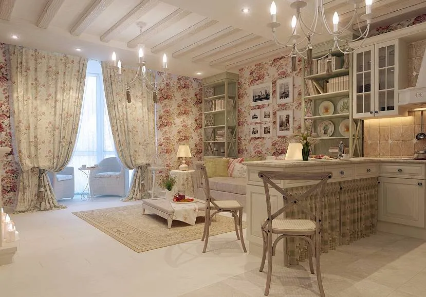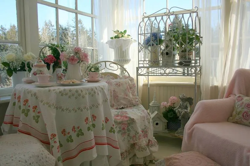 В небольшой гостиной изящно и воздушно будут смотреться такие детали декора, как скатерть, накидки на диваны и стулья, чехлы для маленьких подушек. Старинная совсем простенькая скатерть хорошо смотрится на круглом столе. Любое чаепитие в такой обстановке будет приятным. Чтобы дизайн выглядел завершенным, его дополняют изящными декоративными подставками, красивыми искусственными розами и фарфоровыми вазонами.