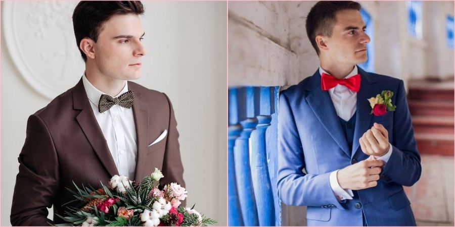 Если говорить о галстуке, идеально гармонирующем с костюмом молодожёна, то он должен сочетаться или контрастировать с тоном одежды. Первое считается достаточно нелёгкой задачей, по этой причине галстуки, либо бабочки нередко выбираются контрастных оттенков.