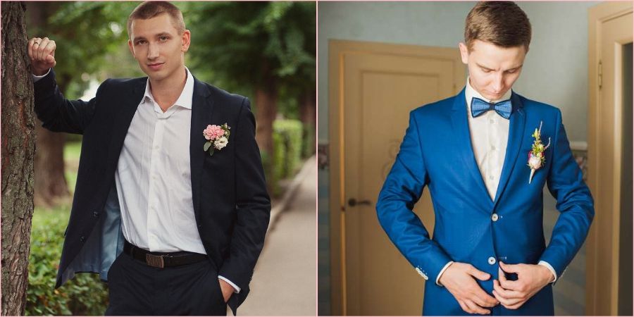 - синий – этот оттенок сейчас находится на пике популярности и его часто стали задействовать женихи и невесты. Он является классическим, а потому хорошо подойдет любому мужчине;