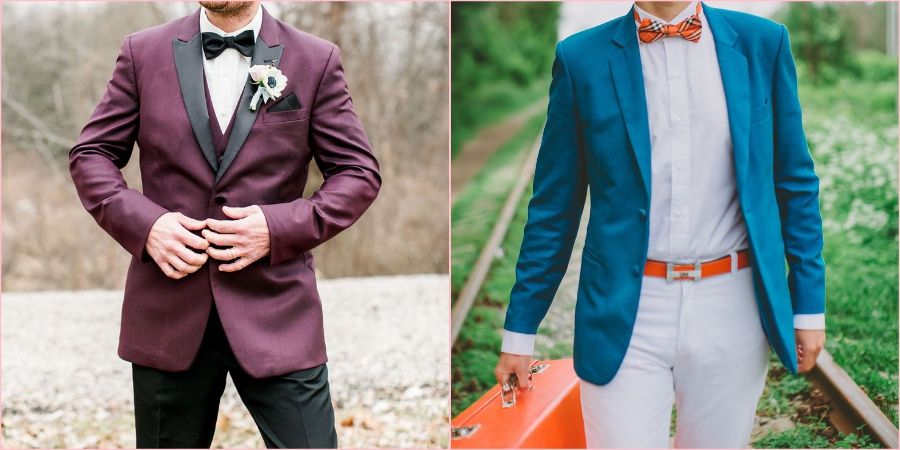 Еще одна необычная вариация – это яркий верх и спокойный низ, главное жениху не ошибиться с пиджаком и подобрать действительно нарядную и элегантную вещь. Делайте акцент на интересный принт, броскую расцветку ткани или же фактурную материю.