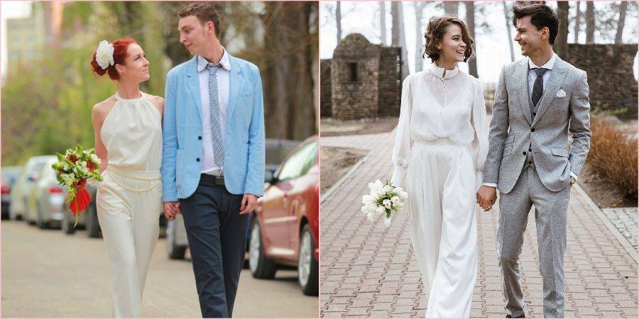 Часто пары одеваются в одном стиле и цветовой гамме. Одним из оригинальных примеров может быть look состоящий из джинсов и белых маек с принтами или с прикольными надписями: «Мой муж», «Моя жена», «Люблю мужа», «Люблю жену», «Лучший в мире муж», «Лучшая в мире жена» и подобными. Нередко девушка дополняет такой образ фатой, что смотрится уместно и интересно.