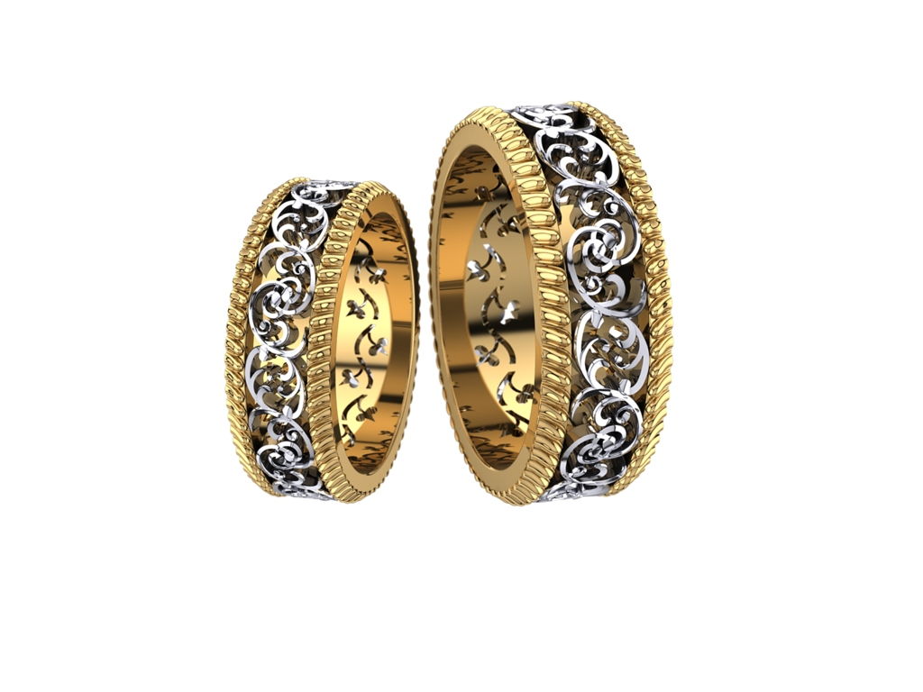 В последнее время дизайнеры все чаще выпускают пары колец, выполненные в виде ажурных ободков. Такой эффект создается благодаря металлической проволоке из драгоценных металлов, которая надевается на каркас.