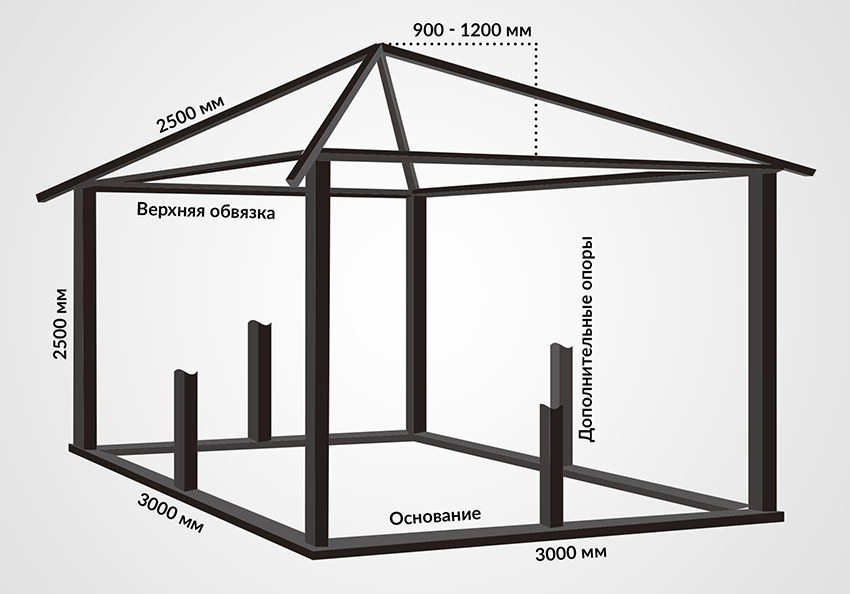 Рассмотрим этапы самостоятельной сборки деревянного шатра, установка которого не требует заливки фундамента под основание. Подобный шатер будет рассчитан на 10-15 гостей (если планируется большее число приглашенных — можно удвоить объем материала и собрать два идентичных шатра рядом).