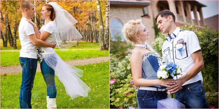 - Повседневное решение для свадьбы. Ваша пара отличается креативным подходом? Тогда вы можете позволить себе заявиться в ЗАГС в майке и джинсах! Не забудьте заранее узнать мнение будущей супруги.