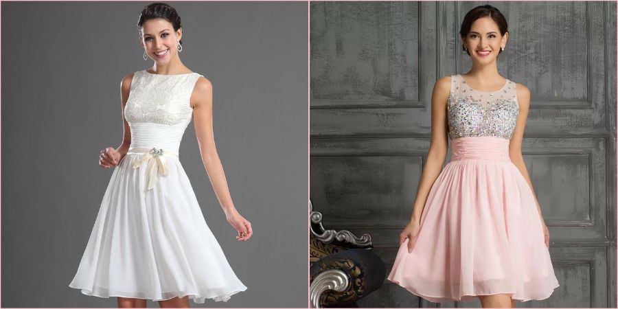 Коктейльное платье. Коктейльное платье – это очень практичный вариант. Потом его можно будет надеть на другое торжество или на свадьбу подруги, если платье не белое. С правильно подобранной прической невеста будет смотреться очень элегантно.