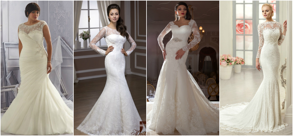 Невестам размера плюс сайз, стоит отказаться от корсетов, которые только подчеркнут лишние килограммы. Для полных женщин прекрасно подойдут фасоны A-образного силуэта, с V-образным вырезом. Юбка клёш всегда будет скрадывать живот и пышные бедра, убирать недостатки фигуры и формировать утонченный грациозный облик. В качестве отделки можно выбрать кружево, оно поможет создать миловидный, чистый и непорочный образ.