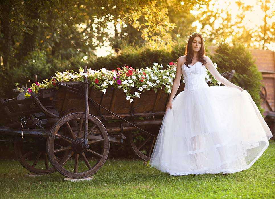 Платье невесты должно быть максимально нежным. С плавными линиями, обрамляющими изящное женское тело. Для свадьбы в стиле прованс девушке следует отказаться от вычурного длинного шлейфа, корсета, излишне пышной юбки. Не подойдут и стразы с блестками.