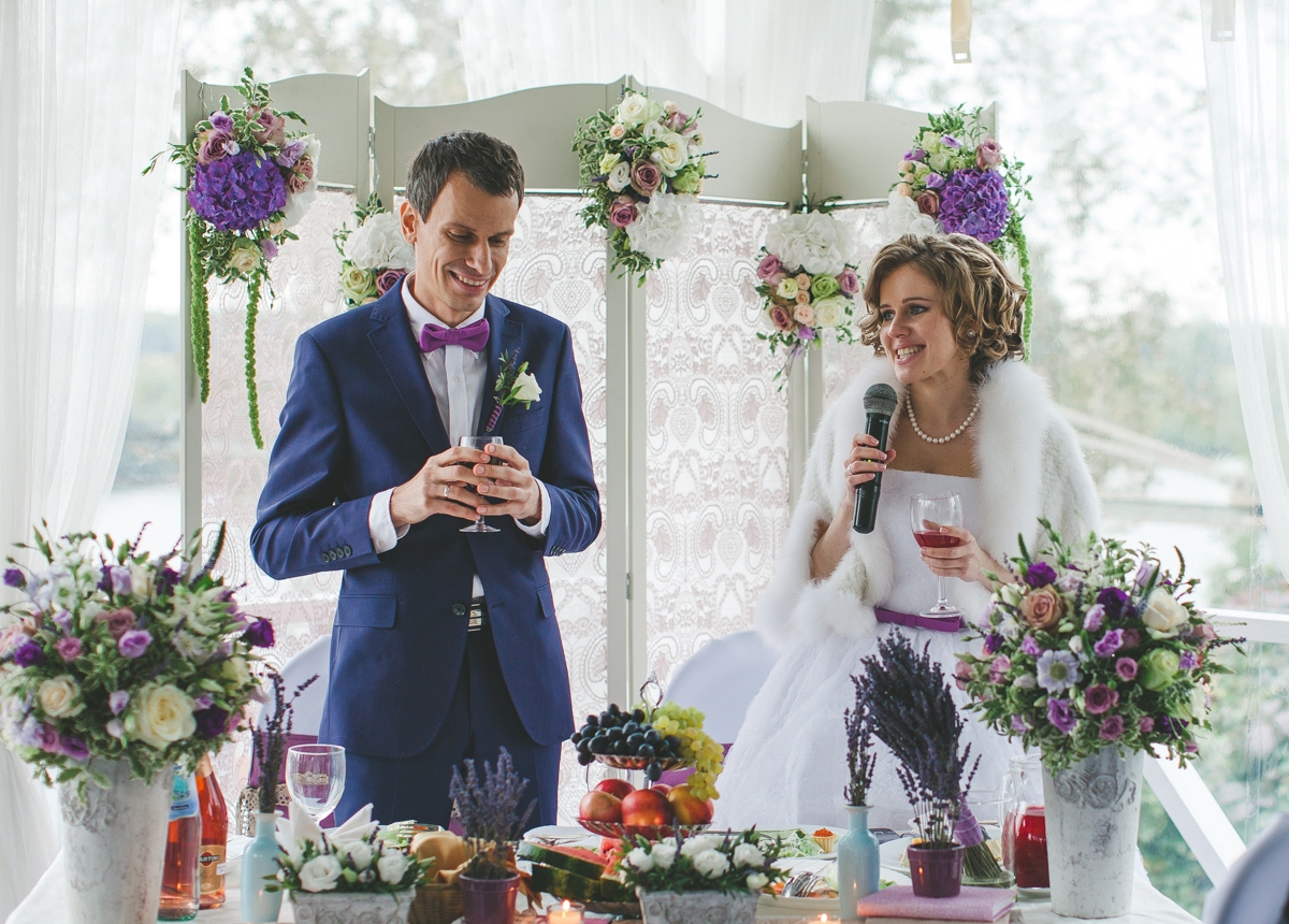 - Цветовая гамма. Главным цветом торжества, конечно же, должен быть лавандовый. Его можно разбавить нежными пастельными тонами молочного, бежевого и оливкового оттенка.