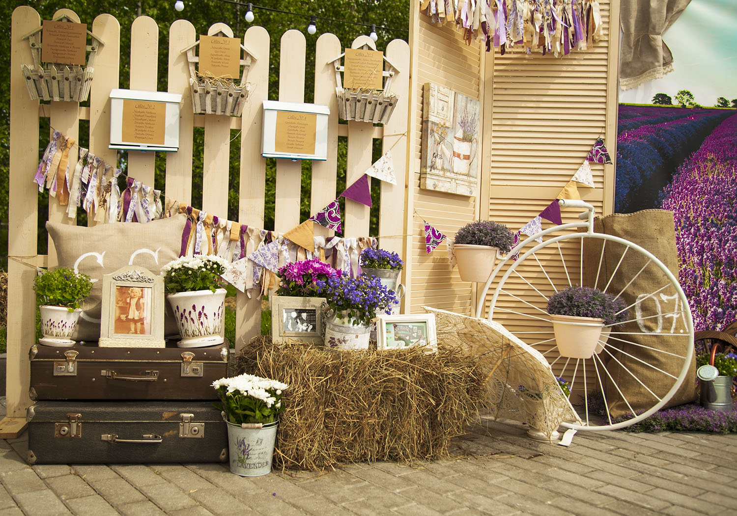 - Декор в стиле Прованс. Так как Прованс — это французский деревенский стиль, то весь декор должен быть простым, натуральным и по возможности винтажным. На таком торжестве идеально будет смотреться утонченная плетенная мебель, разнообразные корзинки, винтажные чемоданы и ящики из-под вина. Последние лучше всего красиво задекорировать лавандой.