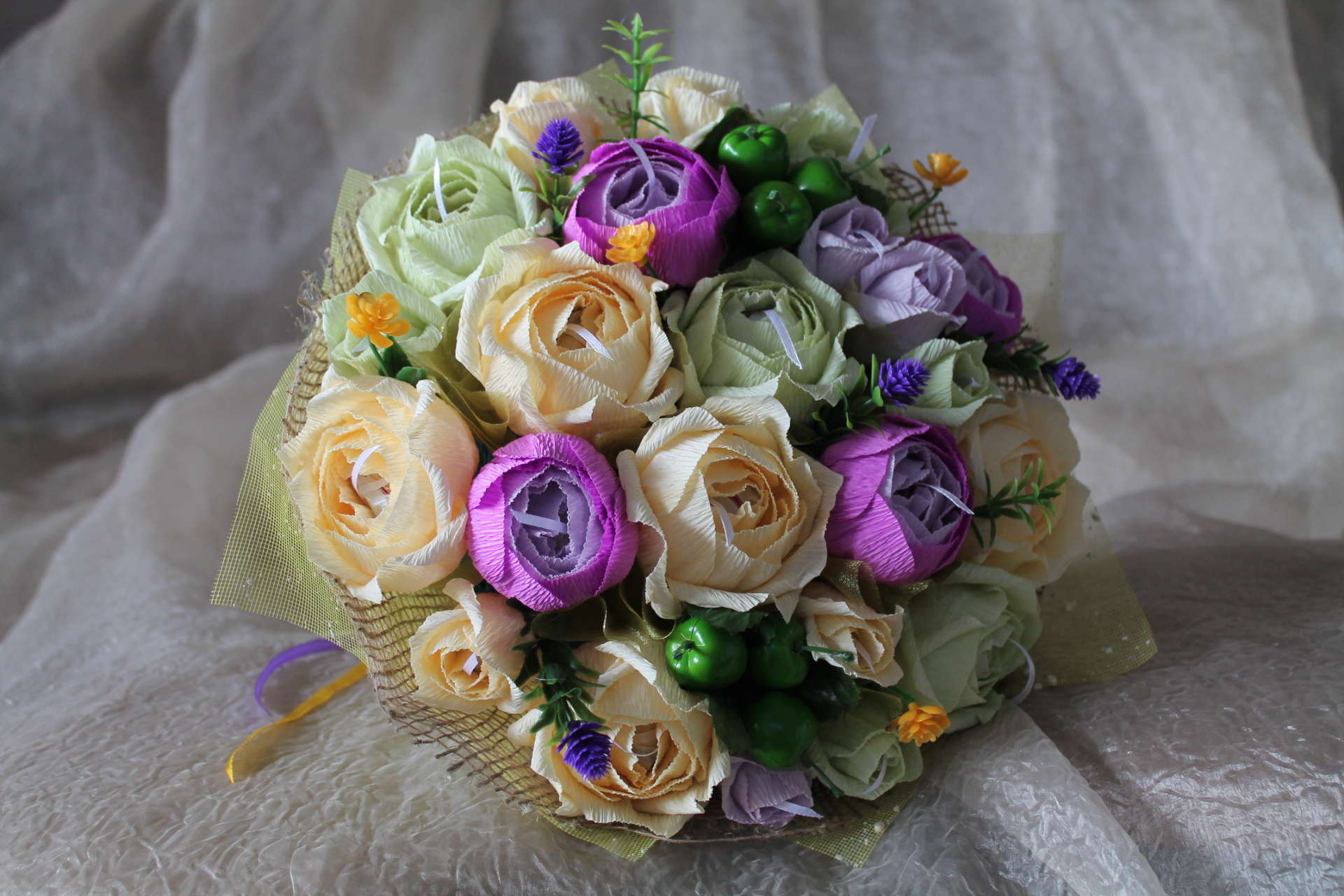 Оригинальный букет для смелых. Плюсы: не испачкает платье, не завянет, не растреплется от дождя и ветра. Никаких сюрпризов с аллергией на пыльцу. 100% поразит гостей. Минусы: нужна хорошая мастерица-рукодельница.
