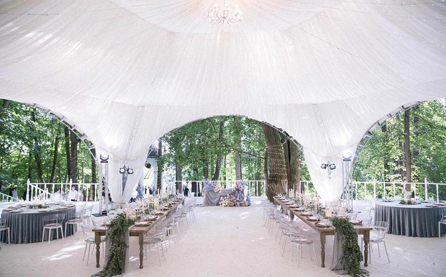 Площадки и вместимость: для церемоний есть ротонда, которую можно украсить по вашему усмотрению. Банкет можно провести на веранде у воды (вместимость – до 50 человек) или в шатре (вместимость – до 100 человек). Стоимость аренды веранды – 100 тыс.рублей, а шатра 120 тыс.рублей.