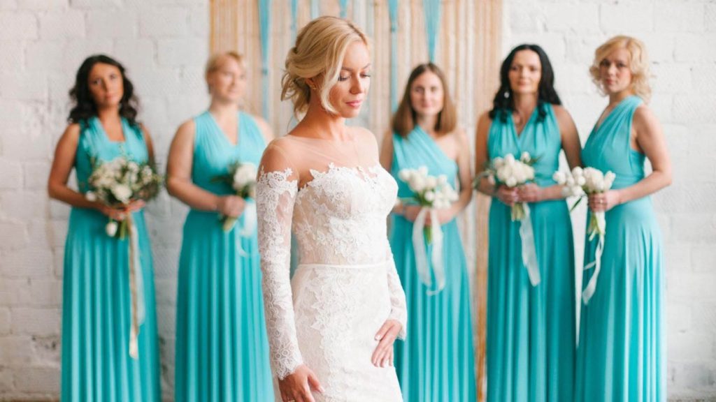 Если планируется дресс-код на свадьбе, стоит заранее предупредить об этом гостей, чтобы каждый смог подобрать соответствующий наряд. Красиво смотрится, когда цвет платьев подружек невесты контрастирует с ее свадебным платьем. Так, к примеру, на свадьбе в цвете морской волны девушки могут выбрать платья одного фасона, но разных оттенков синего. Также одинаковые платья бирюзового цвета для подружек невесты и белоснежное свадебное платье выглядит ярко и гармонично. Если же наряд невесты – нежное бирюзовое платье, тогда подружки могут надеть наряды разные по цвету, но гармонирующие с бирюзовым цветом, например пастельные оттенки желтого, розового. Если же такой возможности нет, дополнить образы девушек можно небольшими букетиками желаемого цвета.