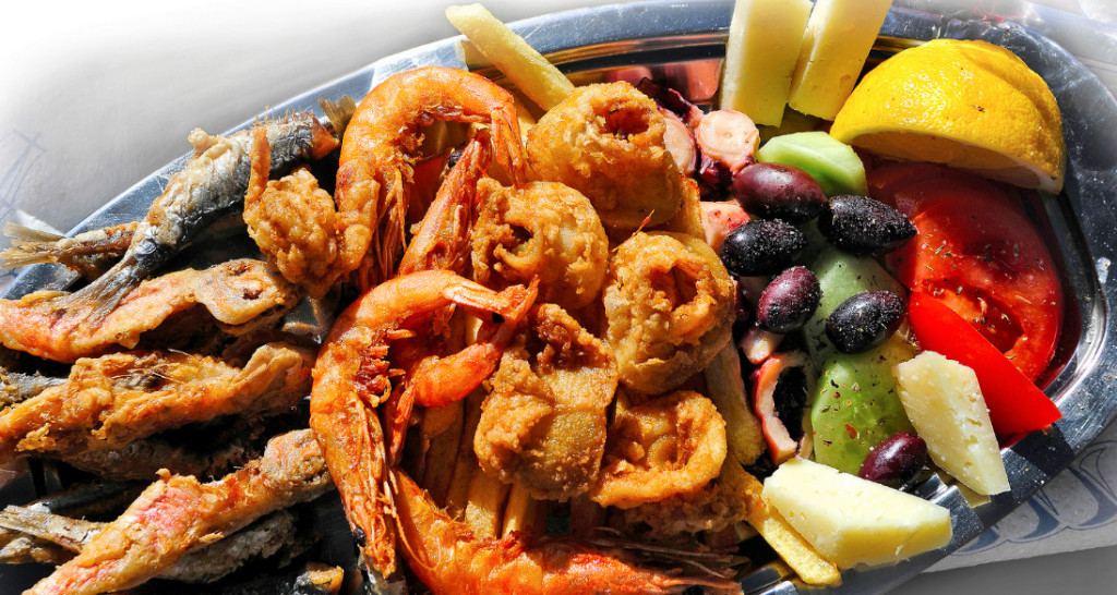 Из рыбных блюд подойдут практически любые, потому что в Греции рыбу очень любят: ее жарят, запекают, коптят на гриле и т.д. То же самое с морепродуктами: осьминоги, креветки, кальмары, мидии — все будут к месту.