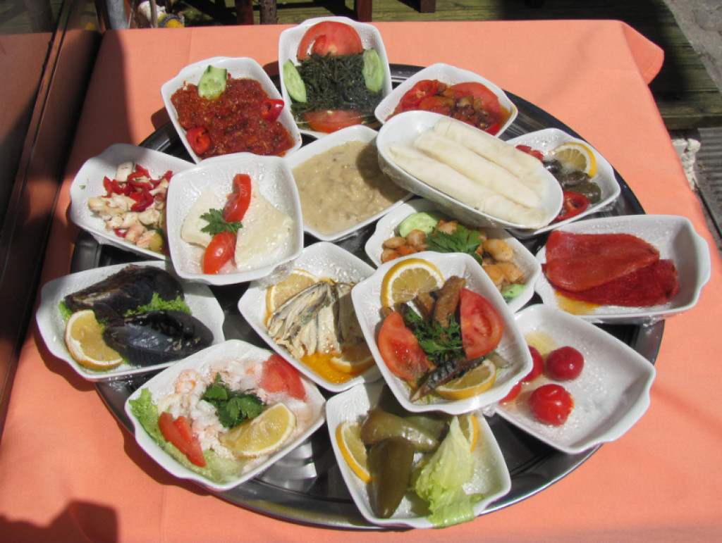 Традиционная праздничная закуска — мезе. Это небольшие угощения, которые подносятся гостям к алкогольным напиткам. На русский мотив — разносолы: маринованные грибочки, оливки, огурчики, листья каперсов и сами каперсы и т.п. В качестве мезе можно выложить порционные мясные и рыбные закуски: тефтельки, маленькие шашлычки, морские деликатесы.