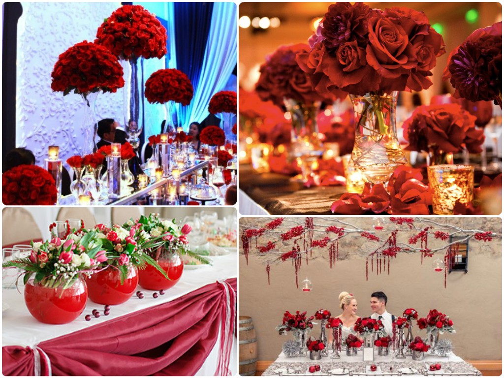 Придать ощущение праздника помогут композиции из красных роз, расставленных в разных углах банкетного зала или на столах. Свечи нужных оттенков придадут особую романтичность свадьбе. Красно-белый цвет свадьбы выглядит поистине роскошно и уместно на свадьбе в стиле «кантри». Здесь для оформления рекомендуют использовать скатерти в клетку в красных тонах, клетчатые салфетки, композиции из цветов и клюквы, вязаный декор насыщенно алых тонов.
