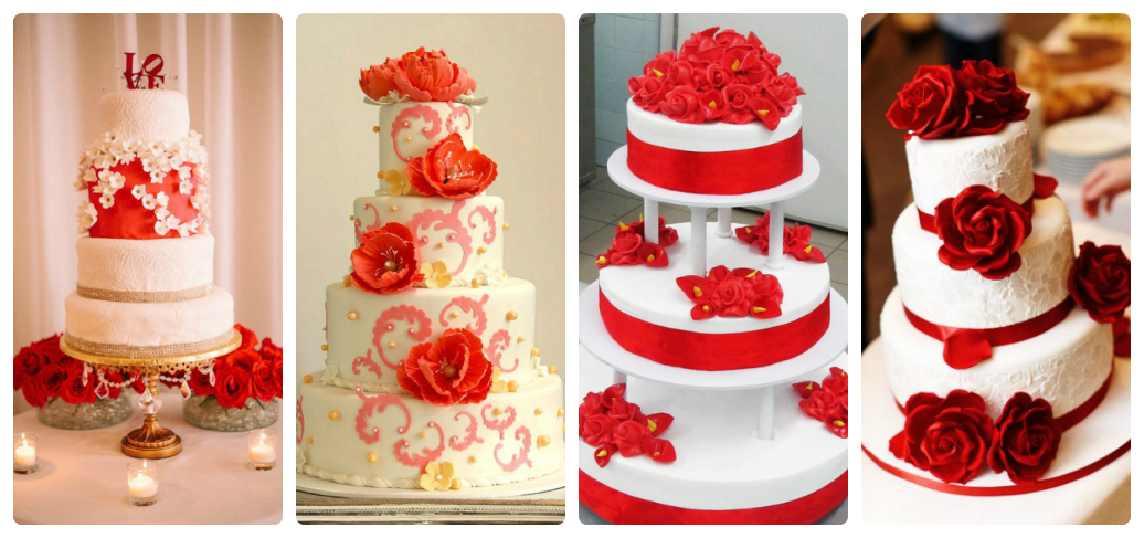 Нельзя себе представить свадебное торжество без кульминационного выноса торта. Фантазия кондитеров иногда восхищает, как и их мастерство. Целые произведения кулинарного искусства бывают представлены на свадебных банкетах. Украшают торты в красном цвете, в соответствии с тематикой праздника. Даже на свадьбе Евы Лонгории торт был ярко-красного цвета.