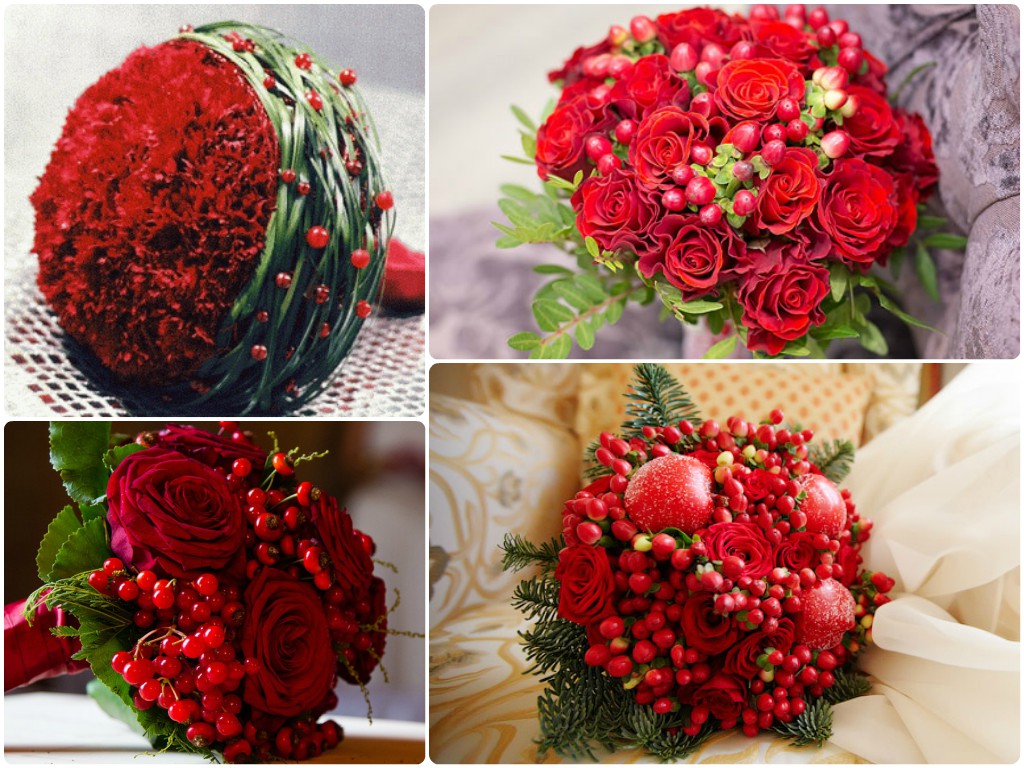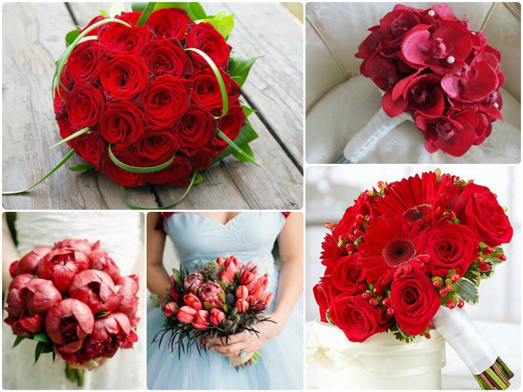 Традиционно сложилось, что самым распространенным цветком в букете невесты является роза. Даже если вы решите остановить свой выбор на этой царице цветов – стоит поэкспериментировать оттенками красного и размерами бутона. Но не стоит зацикливаться на одном виде – разнообразие предлагаемых флористами цветов может только удивлять. Очень нежно смотрятся тюльпаны, орхидеи всех оттенков красного, пионы, герберы и многие другие представители флоры. Зимой можете для композиции можете добавить веточку рябины.