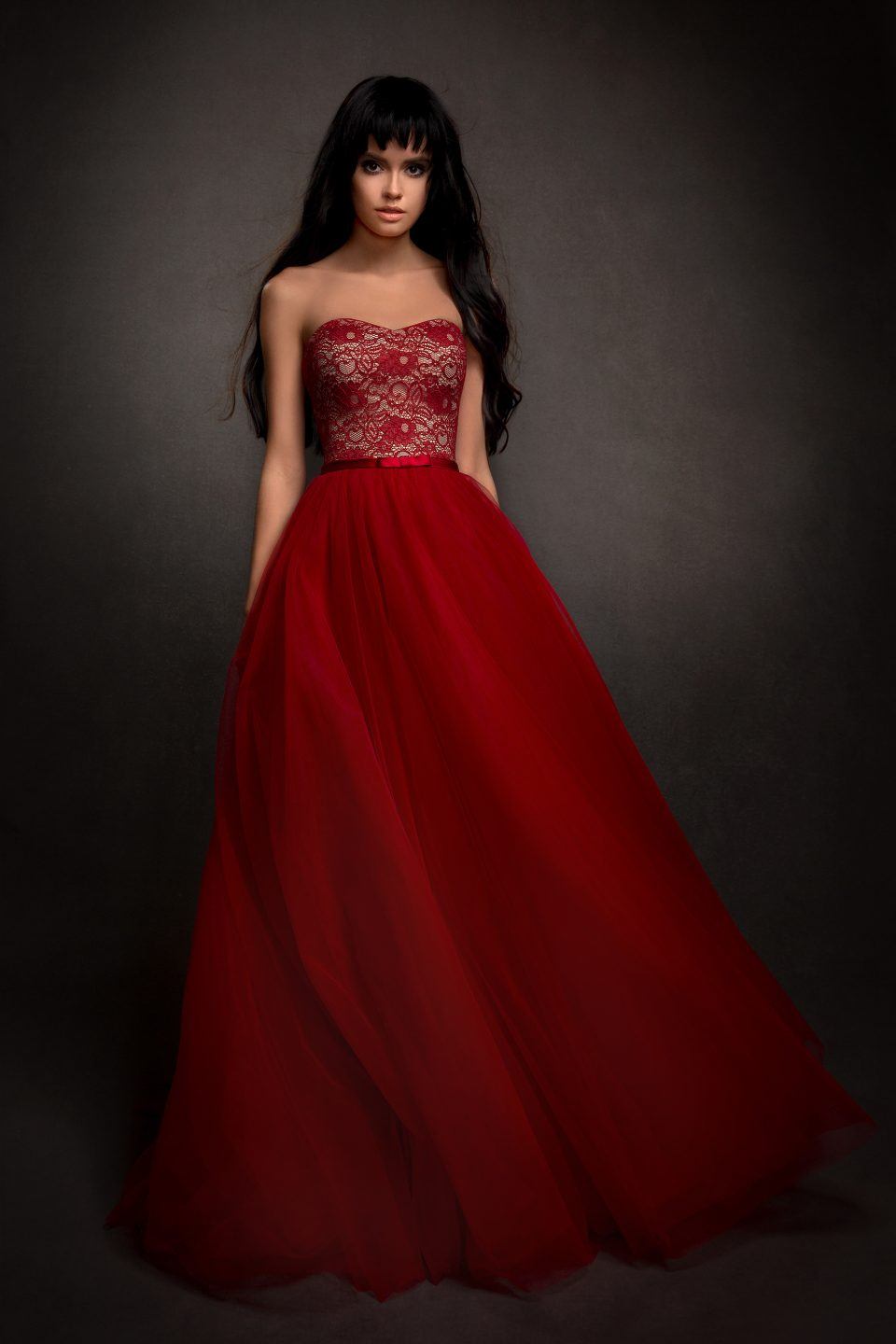 Пышные платья для свадьбы лучше выбирать не в ярких красных оттенках, а в более приглушенных, с легким вкраплением черного и серого тона.