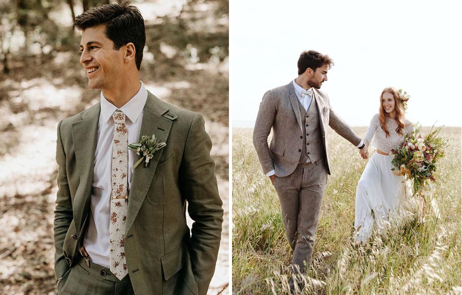 Мужской образ — это удобство и простота. Жених может спокойно отказаться от классического костюма, отдав предпочтение широкой рубахе, красивым штанам любого цвета, кроме черного, стильным подтяжкам, жилетам. Дополнить образ могут шляпы, которые обычно носят в деревне, стильные бабочки. Ткань костюма подойдет клетчатая, а вместо пиджака хорошо впишется вязаный джемпер. Закончить образ поможет бутоньерка из сухоцветов, снопик колосков или букетик полевых трав, приколотых к одежде.