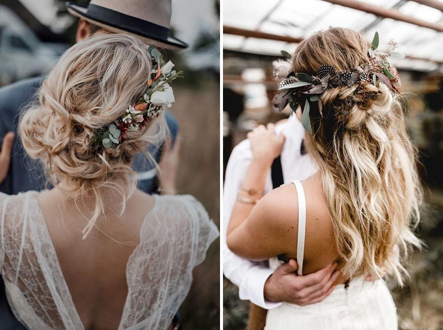 В случае, когда ваш выбор пал на рустикальный стиль свадьбы, это будет не фата, а венок из цветов или один цветок в волосах. Если идея с живыми цветами вам не по душе, их можно заменить нежной диадемой или другими украшениями для волос в виде цветов и веточек. Не забывайте и о шляпках — соломенных, классических и белых, с красивым цветочным декором!