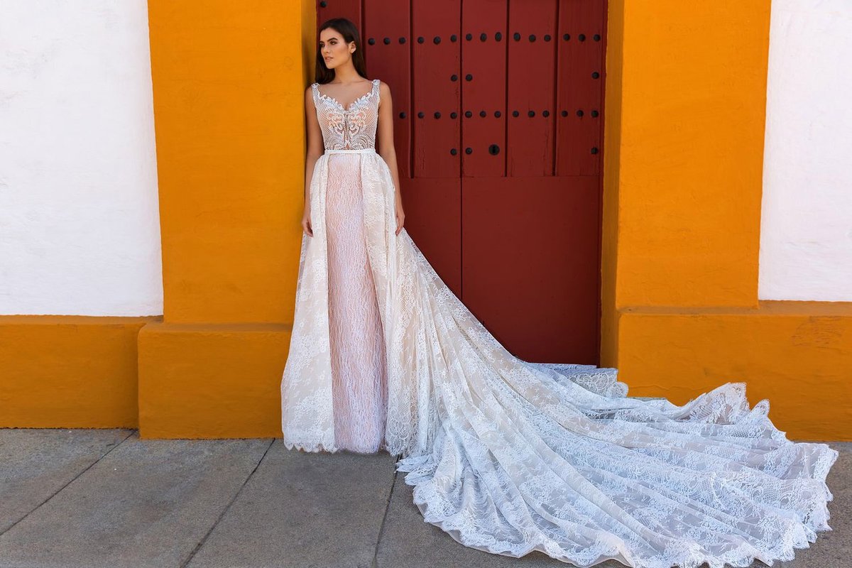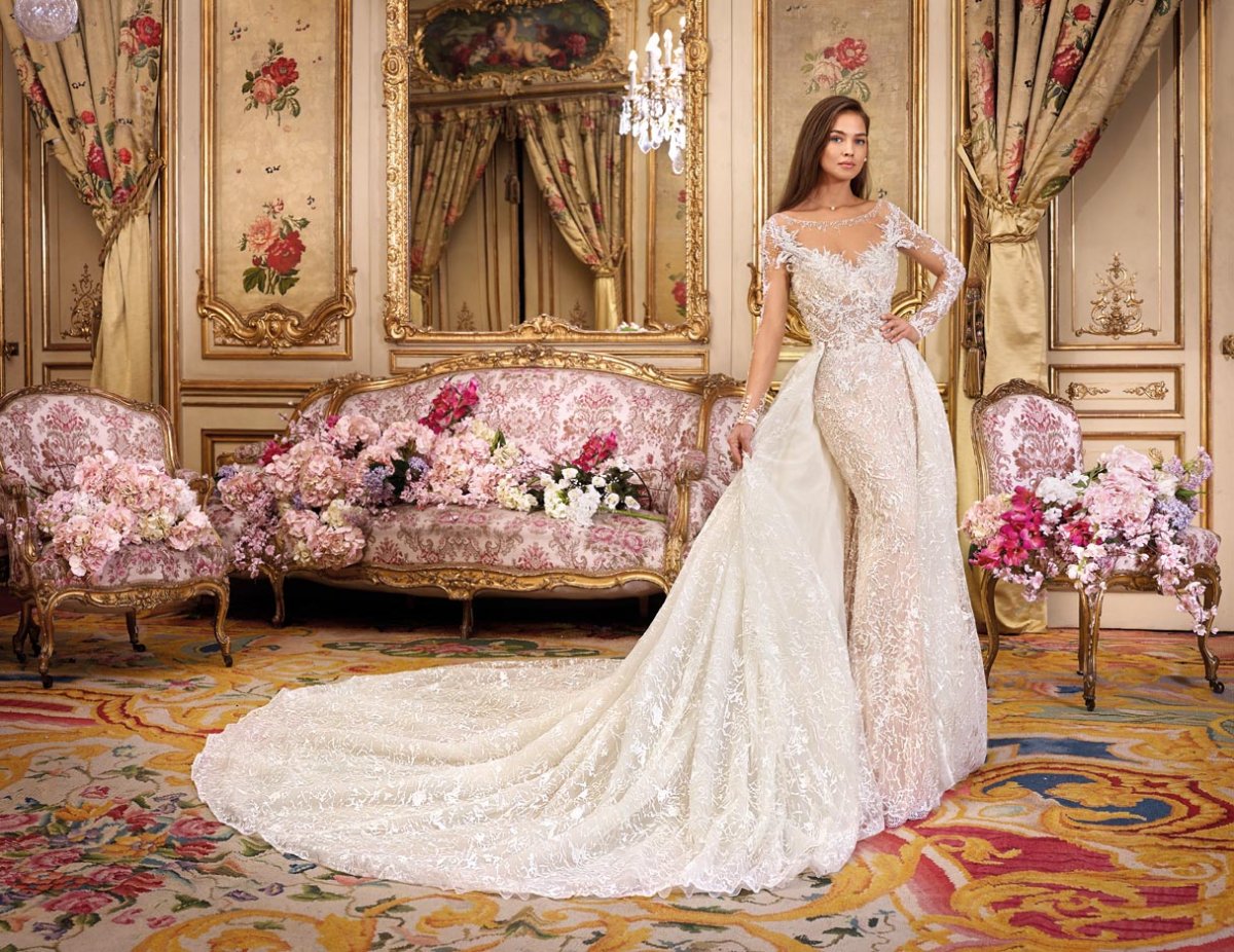 Если вас останавливает практическая сторона вопроса – специально для вас дизайнеры придумали отстегивающийся шлейф, после официальной части уберите неудобный низ и наслаждайтесь танцами!