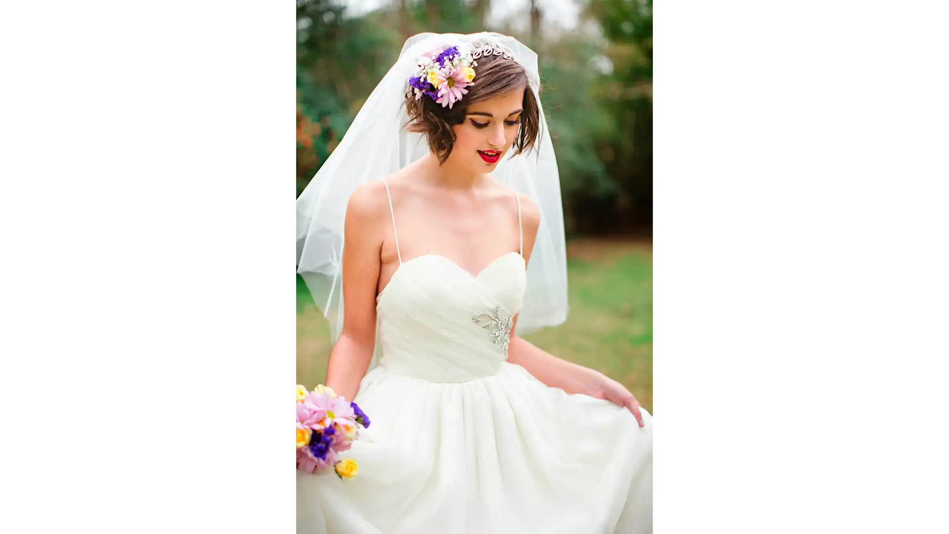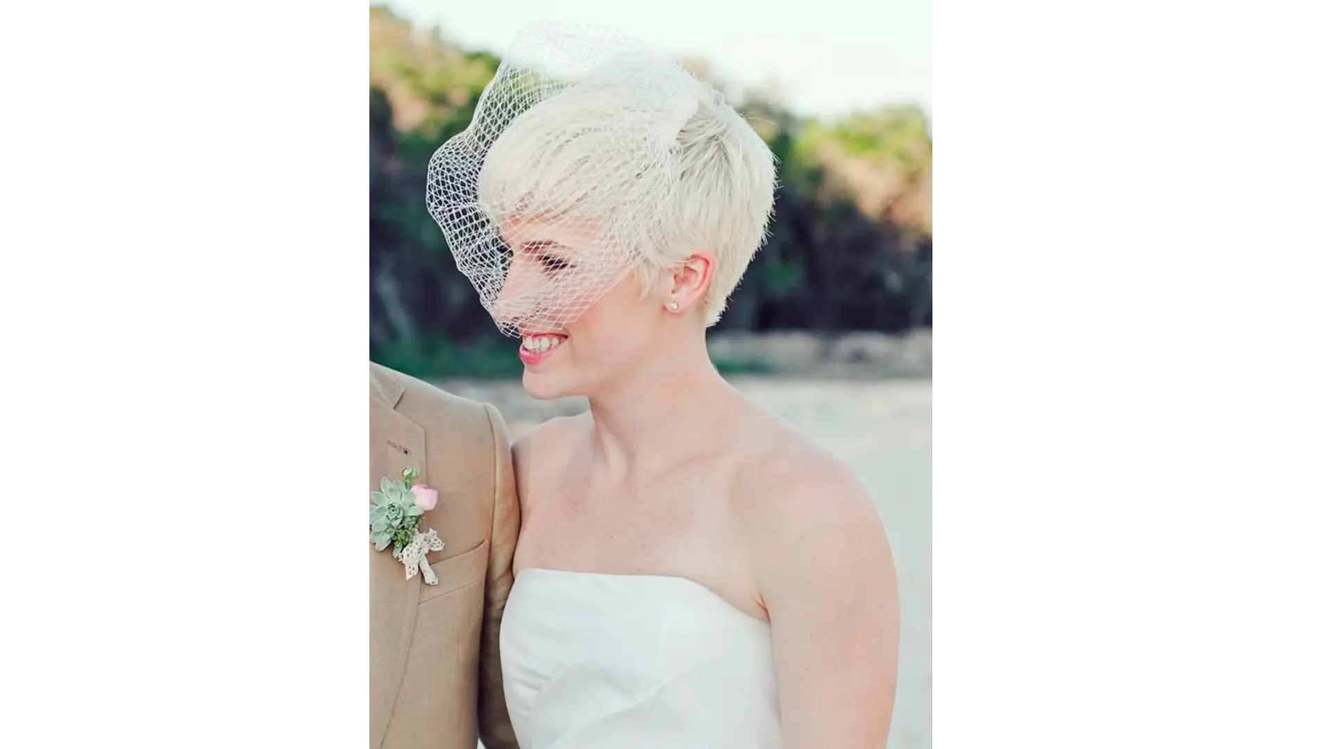 К короткой стрижке можно выбирать фату любой длины. Короткую и среднюю фату крепят к волосам, а длинную – к венку, короне или обручу, потому что ее вес не позволяет надежно зафиксировать ткань на недлинных прядях. Также нежно смотрятся на коротких стрижках элегантные вуалетки из тончайшего фатина.