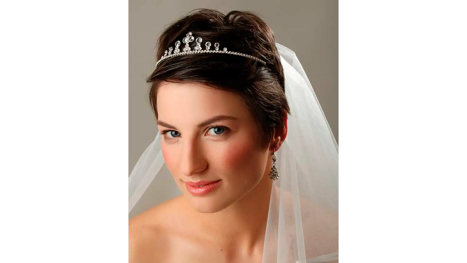 Для коротких волос выбирают аксессуары длиной чуть ниже плеч. Модели из тяжёлых тканей и кружева не требуют дополнительного декора. К более простым вариантам добавляют тонкую изящную диадему или тиару.