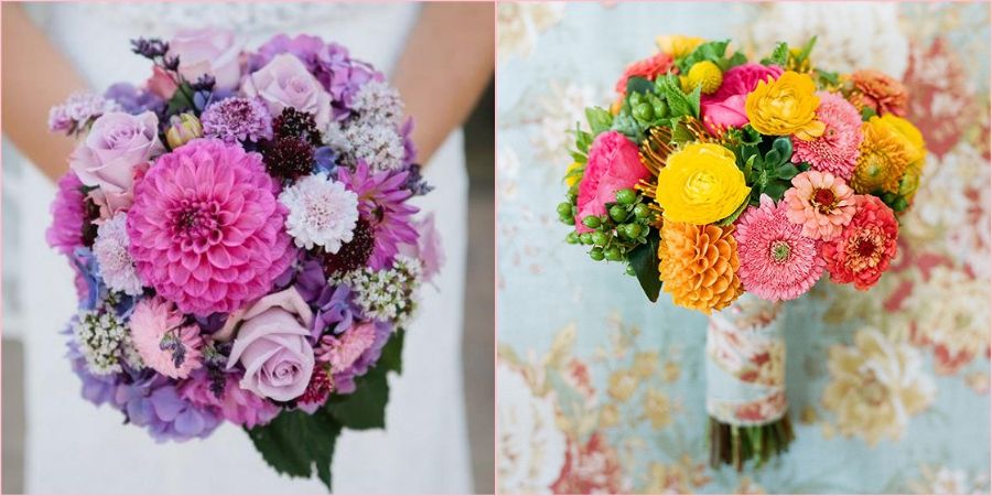 Букет невесты в бордовых тонах хорошо смотрится с добавлением синей, сиреневой и желтой палитры. Получится яркий букет для загородной церемонии. С таким букетом сочетаются легкие ткани, например полупрозрачная накидка или летящие рукава.