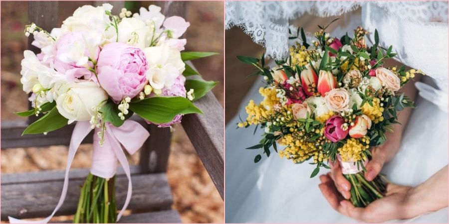 Классический круглый букет подходит стройным изящным девушкам невысокого роста. Каскадная композиция из нескольких ярусов – для высоких невест. Свисающие бутоны и листья выглядят как водопад, но они зрительно уменьшают рост. Поэтому низким женщинам стоит выбрать другой вариант. Для любого телосложения и роста подходит букет-растрепыш. Цветы собирают хаотичным образом, не составляя четкую форму.