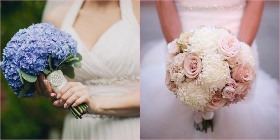Голубые цветы – не очевидный, но очень интересный выбор для современной невесты. Это могут быть ирисы, орхидеи, хризантемы, гиацинты, гортензия. Особенно оригинально и эффектно смотрятся монобукеты в таком оттенке. Они позволяют подчеркнуть безупречную белизну платья или, наоборот, сыграть на контрасте с нарядом бежевого, золотистого или цвета айвори. Свадебные букеты голубого цвета подходят как светловолосым девушкам с голубыми глазами, так и рыжим, а также жгучим брюнеткам.