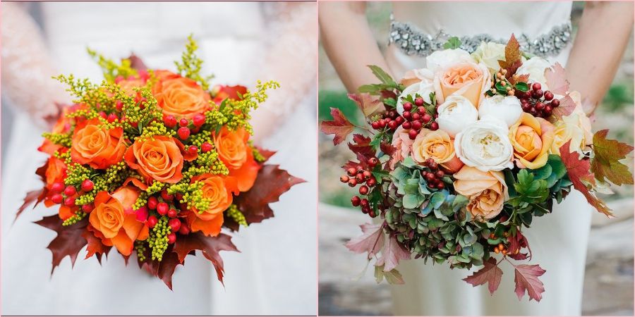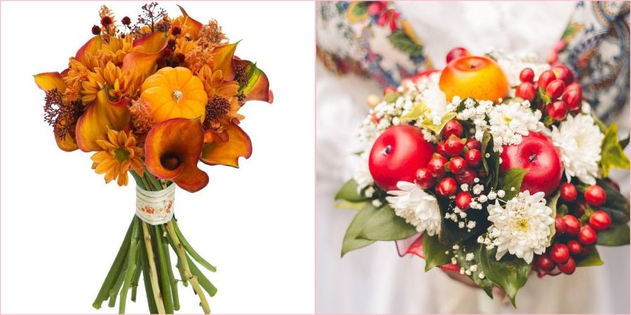 Оригинально добавить к цветам веточки рябины, калины, яблочки небольшого размера или даже тыкву. Также уместно будут смотреться в осенней композиции красивые листья бордового, оранжевого, зеленого и желтого оттенка.