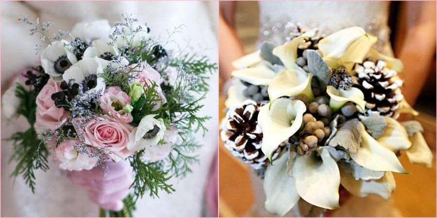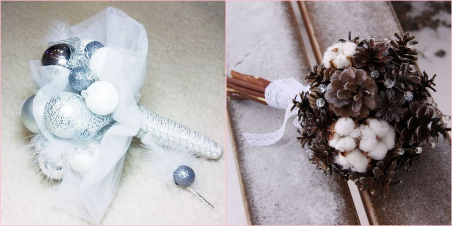 Хорошая идея и вовсе отказаться от живых цветов и отдать предпочтение букету броши из камней, клубков шерстяных ниток, шишек или елочных игрушек. Такие варианты точно не замерзнут и не завянут, сохраняя свой необычный и первозданный вид на протяжении всего праздника.